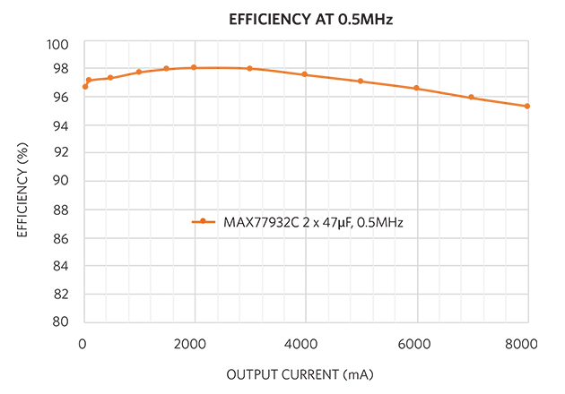 例如,MAX77932 是一款集成電源開關(guān)的兩相開關(guān)電容轉(zhuǎn)換器,可提供 8A 輸出電流并將輸入電壓除以二(見圖 5)。該 IC 適用于使用 2S Li+ 電池的應(yīng)用,同時(shí)為以 1S 等效電壓工作的電路供電。它還適用于從 1S 遷移到 2S 電池配置的應(yīng)用,并允許設(shè)計(jì)人員保留現(xiàn)有的下游 1S 電源架構(gòu)。