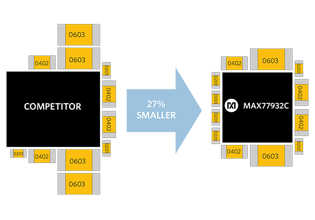 該 IC 采用微型無鉛 0.4mm 間距、2.4mm x 2.8mm 42 引腳晶圓級封裝 (WLP)。小型芯片和小型無源元件的組合使 PCB 占用空間凈面積僅為 14.6 mm?。圖 8 中的比較顯示,與競爭對手的類似解決方案相比,占用空間優(yōu)勢為 27%。