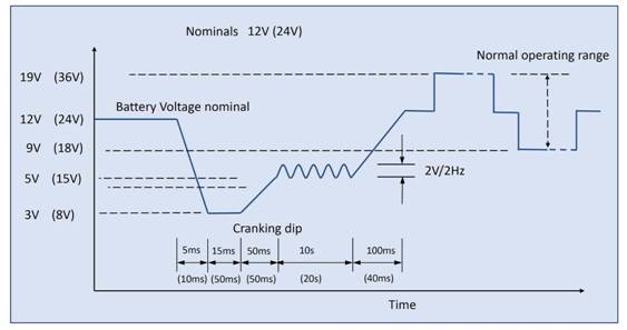 圖2: 軍用車輛直流電源范圍符合 DEF-STAN 61-5,適用于 12V 和(括號(hào)內(nèi))24V 系統(tǒng)