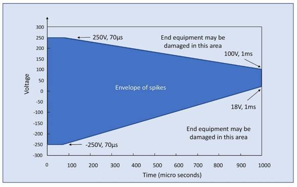 考慮到 MIL-STD 1275/F,要求設(shè)備能夠抵抗短尖峰,峰值高達(dá) +/-250V,持續(xù) 70μs 最大值,在 1ms 內(nèi)線性減小到 +100V 和 +18V 之間的值。任何單個(gè)尖峰的最大能量為 200mJ (圖3)。