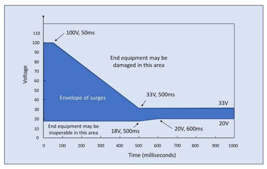 也可能存在高能量浪涌 降至 +100V 持續(xù) 50ms,線性降至 >33V 持續(xù) 500ms,而降至 18V 可持續(xù) 500ms,降至 <20V 持續(xù) 600ms(圖4)。