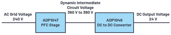 用于功率補(bǔ)償?shù)墓β室驍?shù)校正(PFC)級,可將電網(wǎng)電壓的交流電壓提升至直流中間電路電壓。在240 V交流系統(tǒng)中,這種中間電路電壓一般為380 V,如圖1所示。ADP1047 PFC控制器可以使用DVS,在不影響設(shè)定的380 V電壓的情況下獨(dú)立降低輸出電壓負(fù)載,例如,降低至360 V。在采用部分負(fù)載運(yùn)行期間,此舉可以提高電源的轉(zhuǎn)換效率。
