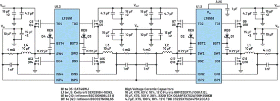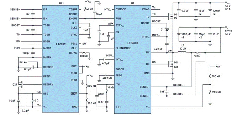 圖2. LT8551電源部分U1.2和U1.3的電路原理圖。LT8551連接至主升壓控制器的接口如圖1所示。VIN = 6 V 至 46 V, VOUT = 48 V (30 A時(shí))。