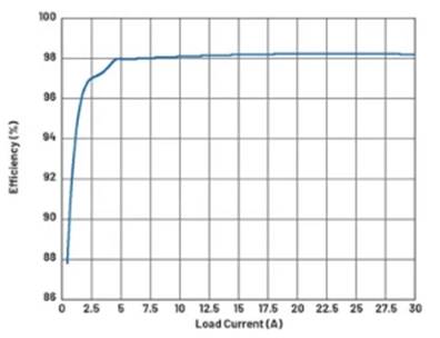圖1和圖2所示的動(dòng)力系統(tǒng)配置包括N通道功率MOSFET Q1至Q20、電感L1至L5,以及輸入和輸出濾波器。轉(zhuǎn)換器的效率如圖3所示,最大輸出電流為30 A,輸出電壓 VOUT = 48 VV,輸入電壓VIN = 24 V。負(fù)載電流應(yīng)降低至低于VIN,以限制輸入電流和熱應(yīng)力。負(fù)載電流降額曲線如圖4所示。LT8551包含內(nèi)部電感電流平衡電路,在相位之間提供出色的均流,從±6%至±10%(最大值)。