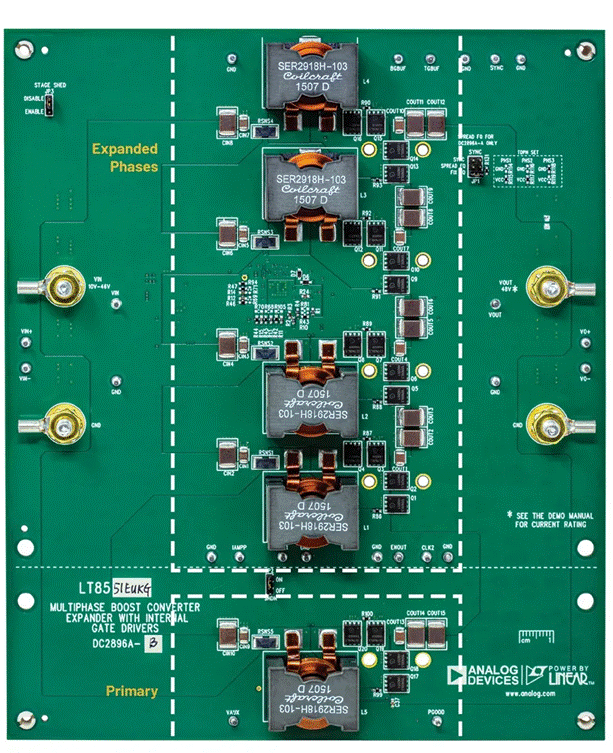 圖5所示為DC2896A-B評(píng)估電路圖片,包含指定的主相位和擴(kuò)展相位。擴(kuò)展相位的熱影像如圖6所示。
