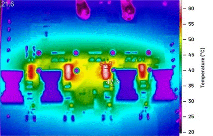 圖6. 在對(duì)流冷卻(無(wú)空氣流動(dòng))情況下,基于LT8551的演示電路的熱影像。25 A時(shí), VIN = 24 V, VOUT = 48 V 。
