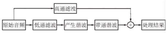 心理聲學(xué)實(shí)驗(yàn)中,存在一種“虛擬音調(diào)”的實(shí)驗(yàn)現(xiàn)象:人耳在基頻缺失的情況下利用諧波組合重建信號(hào)音調(diào)高低。主要流程如下圖,產(chǎn)生諧波主要方法為MaxxBass算法和VB Phase Vocoder。