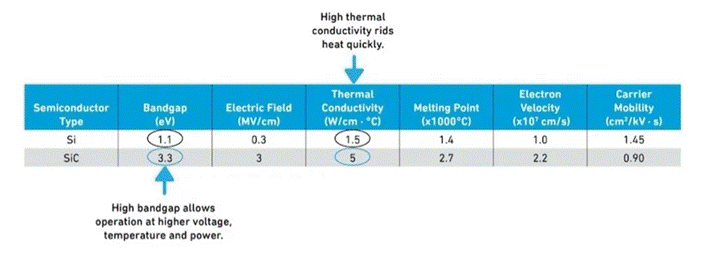 從下圖可以看出,與Si材料相比,SiC有兩個(gè)突出優(yōu)勢(shì):一是SiC的高禁帶寬度(是Si的3倍)帶來(lái)了更高的擊穿電壓、溫度和功率等級(jí);二是SiC具有更高的熱導(dǎo)率,有利于功率器件熱性能的提升,以支持更高電流密度的應(yīng)用。