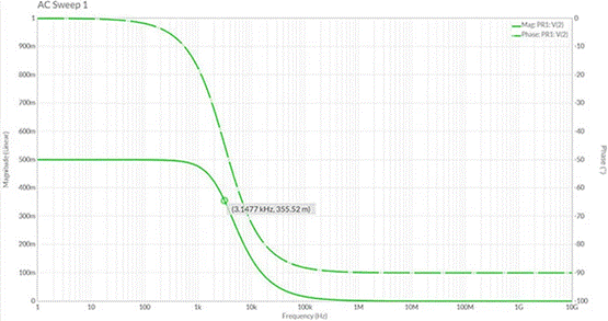 圖 2: MultiSim頻率掃描的結(jié)果顯示,在截止頻率下,濾波器輸出幅度從1.0V下降到0.71V。