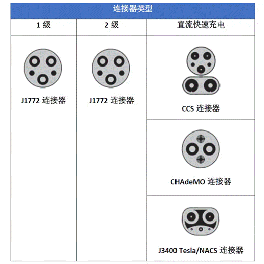 就像我們有不同的充電機級別來區(qū)分功率級別一樣,充電機所使用的連接器也有不同的標準。