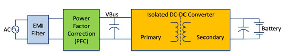 通常,OBC 主要包含三個(gè)模塊:EMI 濾波器、功率因數(shù)校正 (PFC) 級(jí)和包含獨(dú)立初級(jí)與次級(jí)部分的隔離式 DC-DC 轉(zhuǎn)換器。