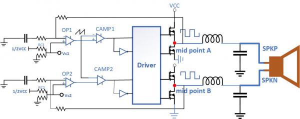 Class D功率放大器輸出與輸入音頻信號(hào)相對(duì)應(yīng)的脈沖,A點(diǎn)和B點(diǎn)的脈沖由半橋開關(guān)產(chǎn)生。低通濾波器由電感和電容組成,為從這些高頻脈沖中解調(diào)出的音頻信號(hào)提供路徑,解調(diào)后的音頻信號(hào)通過揚(yáng)聲器,將電能轉(zhuǎn)換為聲能,然后被人的耳朵聽到。如果用戶在開始播放音樂或計(jì)劃停止音樂時(shí)總是聽到爆裂聲或點(diǎn)擊聲,這將是非常糟糕的體驗(yàn)。