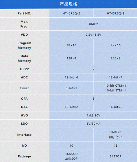 HT45R6Q-2/HT45R6Q-3具有2K/4K×16 OTP Memory、128/256×8 RAM,10/15個(gè)多功能I/O引腳。4/7個(gè)通道12-bit ADC,用于測量電壓、溫度等信號,另提供一組20/40倍OPA,將電流信號放大,降低電流偵測電阻的電阻值,增加電流判斷精準(zhǔn)度,提高轉(zhuǎn)換效率。