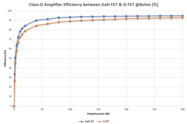 圖3. GaN與Si開關(guān)器件在D類音頻功放的應(yīng)用中的效率曲線對比圖(負(fù)載8歐姆)