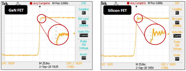 圖4. 開關(guān)波形比較:GaN FET波形(左)和Si FET波形(右)