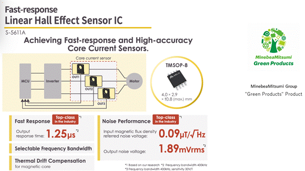 今天推出的新產(chǎn)品「S-5611A」是可編程的高精度線(xiàn)性霍爾效應(yīng)IC,實(shí)現(xiàn)業(yè)界最快速度的1.25μs高速響應(yīng)(※2)和業(yè)界最小等級(jí)的0.09μT/√Hz低噪音(※3),可以正確測(cè)量微小的電流變動(dòng),有助于提高換流器控制性能。