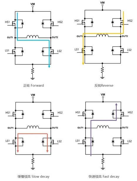 • 快速續(xù)流 Fast decay:若此時(shí)打開LS1和HS2,則會在繞組兩端施加一個(gè)負(fù)電壓,繞組電流會被電源快速吸收,即快速衰退。