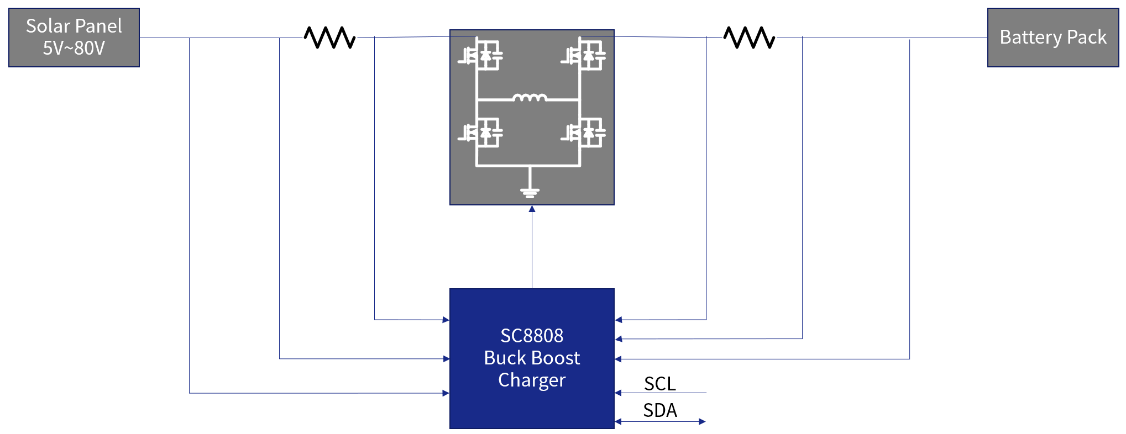 目前市場上常見的儲能電池充電方案通常采用分立器件和 MCU 數(shù)字控制器,存在系統(tǒng)開發(fā)周期長,外圍電路復(fù)雜等問題。SC8808/SHP8808 集成了多種控制邏輯和算法,如下圖所示,開發(fā)者僅需外接必要的 MOS 管和電阻即可實(shí)現(xiàn)高效的儲能充放電系統(tǒng),無需分立方案中 MCU、驅(qū)動芯片、電壓/電流運(yùn)動、比較器等器件。考慮到光伏與儲能的一體化應(yīng)用,這兩顆芯片還內(nèi)置了 MPPT 算法,可高效靈活地實(shí)現(xiàn)光伏電池的最大功率點(diǎn)跟蹤。