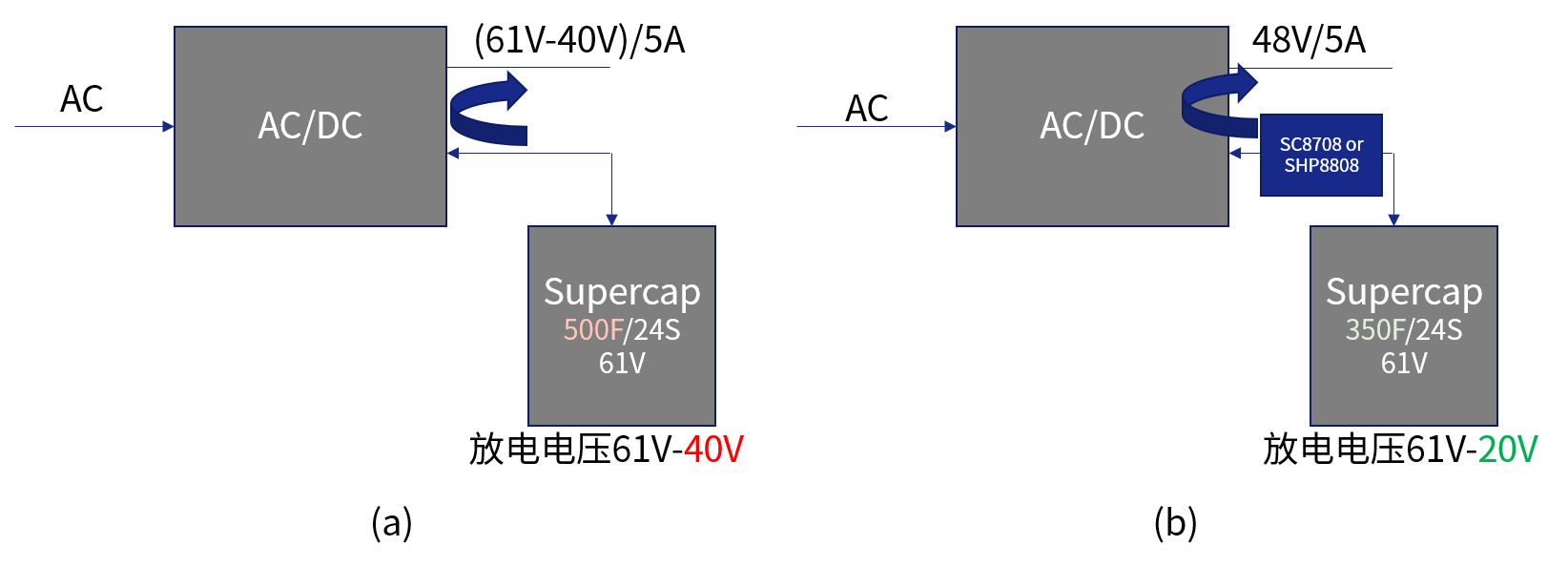 左:電力 DTU 供電傳統(tǒng)方案(61V 放電至 40V);右:電力 DTU 供電推薦方案(61V 放電至 20V)