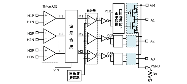 正弦波激勵驅動通過由高邊和低邊開關組成的驅動器所具備的三相控制和驅動電路來實現(xiàn)驅動。以下是帶有傳感器的正弦波激勵PWM驅動的電路框圖和各輸入輸出波形圖示例。 其基本工作是將來自三個霍爾傳感器的信號輸入至霍爾放大器的輸入端,經過波形合成的信號通過比較器和三角波轉換為PWM信號,由輸出段MOSFET來驅動電機的線圈。A1、A2、A3的PWM信號的等效電壓為120度相位差的正弦激勵波形。120度激勵是120度導通60度關斷的矩形波激勵方法,但正弦波驅動則是180度激勵,由于是通過正弦波對零到最大值實施激勵,因此工作更平穩(wěn),噪聲更低。另外,PWM還有助于提高效率。