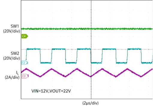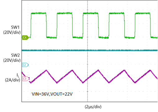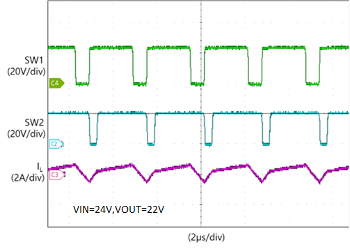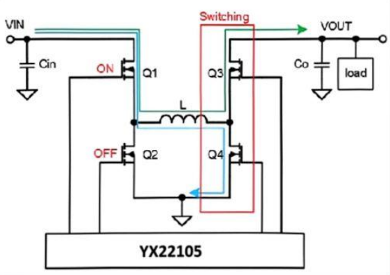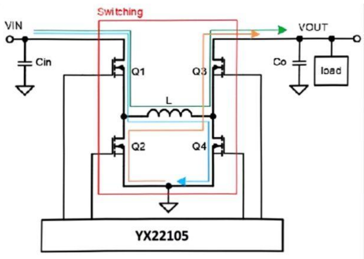 YX22105 能夠根據(jù)輸入輸出電壓自適應(yīng)的進(jìn)入降壓,升壓,升降壓模式;同時保證模式切換時具有優(yōu)異的暫態(tài)性能,使輸出的過沖、跌落風(fēng)險降到最低。