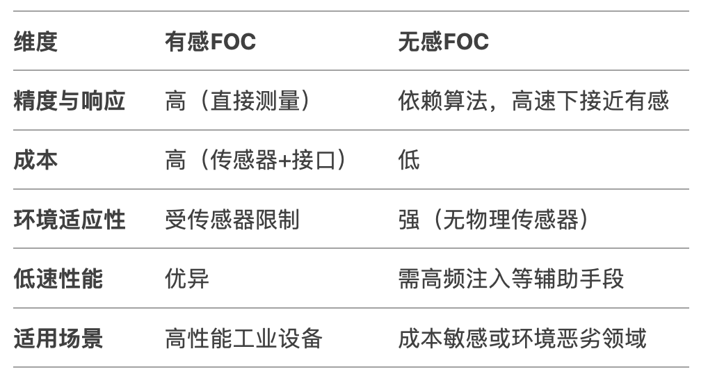 綜上所述,有感FOC和無(wú)感FOC之間的對(duì)比如下圖所示。