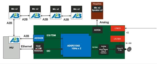 A2B是一種數(shù)字音頻傳輸方案,在音頻輸出輸入端只需要輸出I2S、TDM等這些數(shù)字音頻格式的音頻到A2B芯片,就能夠直接傳輸?shù)綄?duì)端,繼而對(duì)端的A2B接收器便可以實(shí)現(xiàn)解碼輸出。此方案能避免我們進(jìn)行本地?cái)?shù)模轉(zhuǎn)化和遠(yuǎn)端模數(shù)轉(zhuǎn)化的過(guò)程,從而減少音頻損失。在AD、DA的轉(zhuǎn)化過(guò)程中,不管位數(shù),采樣率做得多高,都會(huì)產(chǎn)生一定的音頻損失。