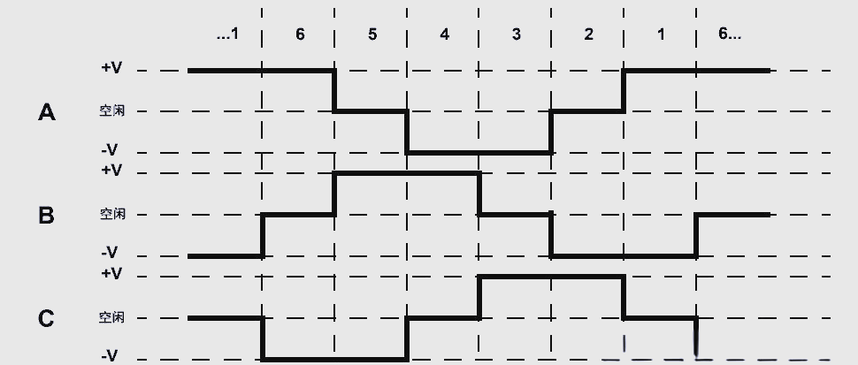 為了確保轉(zhuǎn)子磁鐵能夠完成完整的360度旋轉(zhuǎn),我們可以靈活運(yùn)用線圈A、B和C的六種不同組合,這些組合在以下的時序圖中得到了清晰的展示。