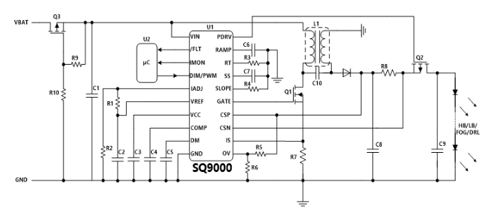SQ9000是一款車規(guī)級LED驅(qū)動(dòng)控制器,采用高精度峰值電流控制模式可支持BUCK、BUCK-BOOST、SEPIC、BOOST等拓?fù)浣Y(jié)構(gòu)的應(yīng)用。這款控制器具備 4.5V 至 65V 的極寬輸入電壓范圍,支持開關(guān)頻率外部可設(shè)置,以及具備抖頻調(diào)制技術(shù),展現(xiàn)出卓越的EMI性能。