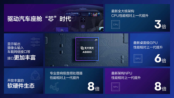 紫光展銳推出全新一代旗艦級智能座艙芯片平臺A8880,該平臺CPU性能相較上一代提升3倍,GPU性能提升6倍,NPU性能提升8倍,專業(yè)音響級音頻DSP,性能同比提升8倍,達行業(yè)領(lǐng)先水平。顯著的性能提升,為智能座艙提供了更流暢的交互體驗、更高質(zhì)量的圖形處理和計算能力。