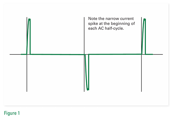 由于 LED 是二極管,因此其穩(wěn)態(tài)電流比白熾燈低得多,而且它們?cè)诮涣麟妷旱拿總(gè)半周期里的初始開啟電流可能高得多且持續(xù)時(shí)間約幾微秒。因此,在每個(gè)交流電壓半周期的開始處都可以看到電流尖峰。圖 1 顯示了典型的電流尖峰。通常,交流二極管替換燈的電流尖峰為 6-8 A 峰值;穩(wěn)態(tài)電流小于 100 mA。
