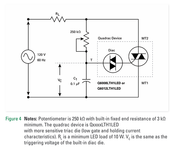 圖4注:電位器為 250 kΩ,內(nèi)置固定端電阻最小為 3 kΩ。Quadrac 器件為 QxxxxLTH1LED,具有更靈敏的三端雙向晶閘管芯片(低柵極和保持電流特性)。RL 是 10 W 的最小 LED 負(fù)載,VC 與內(nèi)置雙向可控硅芯片的觸發(fā)電壓相同。