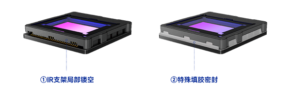 而TCOM在實現(xiàn)小型化設計的同時,兼具了性能和成本上的優(yōu)勢。首先,改善支架設計。在連接CIS與FPC電路板的金線兩側,IR支架局部鏤空,寬度縮短約10%。然后采用獨特的填膠工藝和設備,在元器件放置兩側、IR支架與元器件之間,按一定角度完成填膠密封。