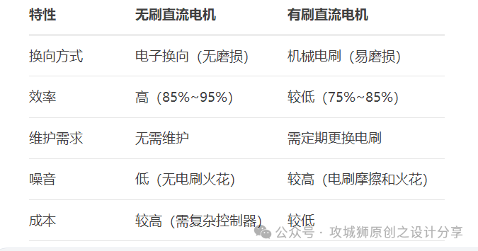 5.直流有刷電機和無刷電機特性對比: