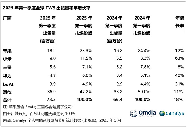 市調(diào)機構Canalys最新數(shù)據(jù)顯示,2025年第一季度,全球真無線耳機(TWS)市場強勁反彈,出貨量同比增長18%,達到7800萬臺,創(chuàng)下自2021年以來的最高增速。