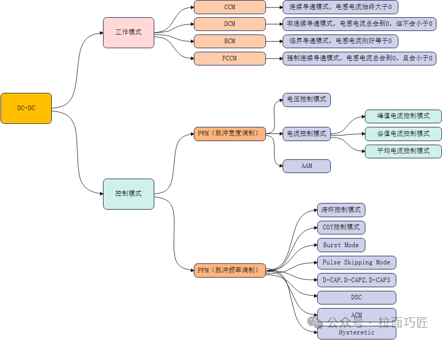 大家好,今天跟大家聊一聊有關DCDC工作模式和控制模式的基本概念。我們在學習開關電源的過程中,經(jīng)常會遇到各種各樣的概念,比如CCM,DCM,PWM,PFM。。。這些概念種類太多,以至于我們時常會產(chǎn)生迷糊,甚至會把兩個不同維度的概念放到一起比較,這里我們就來把它們捋一捋,讓大家能夠更清晰的了解到這些概念的區(qū)別。首先我們來看一張圖,工作模式和控制模式可以歸納總結為圖中的幾種方式,下面我們來逐步把這些模式講清楚。