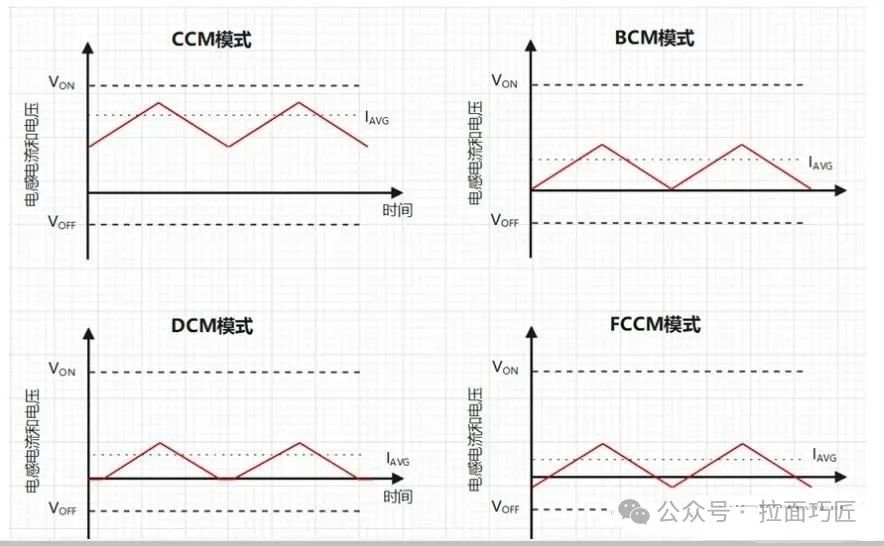 我們知道,任何一個開關電源最終都會工作在穩(wěn)定狀態(tài)下,即輸出穩(wěn)定的電壓為負載供電,但是負載所需要的能量是動態(tài)變化的,既然電壓不能變,那么就需要去控制電感中的電流跟著動態(tài)變化,那么就以電感中的電流狀態(tài)劃分了幾種工作模式。通過圖中我們可以很清晰的看到這幾種工作模式下電感中的電流變化趨勢,