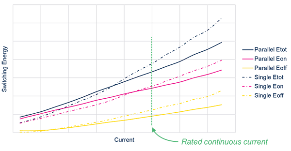 開關(guān)能量的變化曲線不是線性的,略呈指數(shù)趨勢(shì)。因此,電流加倍會(huì)導(dǎo)致能量增加超過兩倍。并聯(lián)時(shí),結(jié)果正好相反:如果將電流均分到兩個(gè)相同的器件,總開關(guān)能量會(huì)比單個(gè)器件單獨(dú)開關(guān)時(shí)更低。