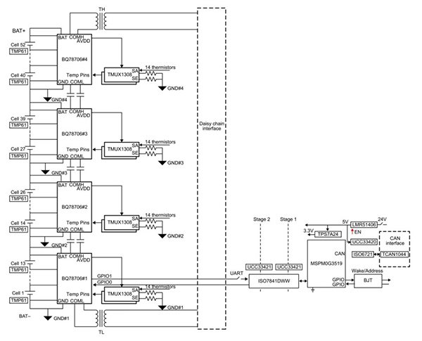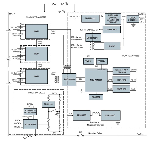 圖 2. 適用于儲能系統(tǒng)參考設(shè)計的電池控制單元參考設(shè)計圖(顯示了可堆疊 BMU 架構(gòu))