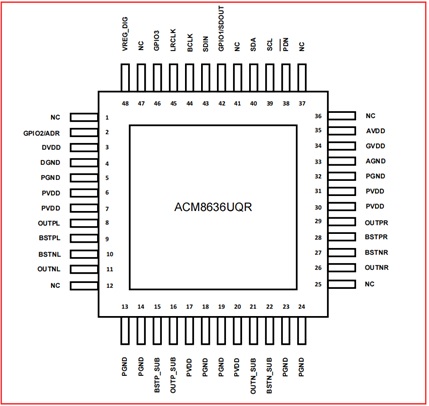 ACM8636一款2.1通道數(shù)字輸入音頻功率放大器。供電電壓范圍在 4.5V-26.4V。在2.1通道工作模式, 2 x 8 歐+4 歐負載下,輸出功率可以達到2×30W+60W ; THD+N不超過1%。
