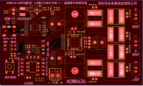 深圳市永阜康科技有限公司一直專注于音頻領(lǐng)域的耕耘,現(xiàn)在大力推廣一款內(nèi)置DSP、60W+2X30W大功率I2S輸入2.1聲道數(shù)字功放芯片-ACM8636。供電電壓范圍在