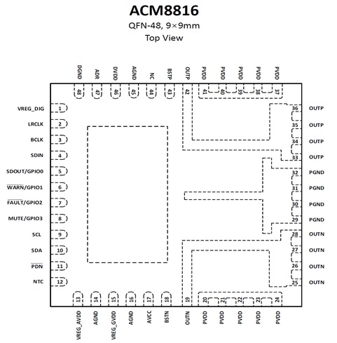 ACM8816采用QFN-48(9.0mm× 9.0mm)封裝。