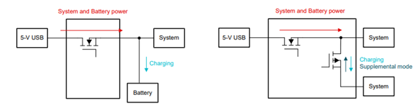 圖 1 展示了非電源路徑器件具有一條充電路徑,其中系統(tǒng)和電池連接到同一個(gè)節(jié)點(diǎn)。由于您無(wú)法控制用于為系統(tǒng)供電的電流與為電池充電的電流,因此當(dāng)您無(wú)需同時(shí)使用系統(tǒng)和為電池充電時(shí),非電源路徑充電便是有效的選擇。剃須刀或電動(dòng)自行車(chē)等應(yīng)用非常適合非電源路徑充電器。