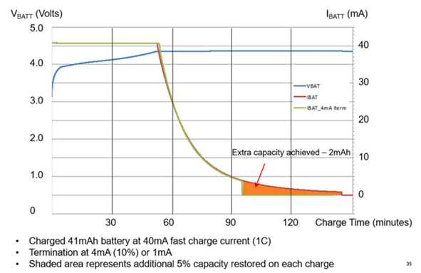 圖 2 還重點(diǎn)說(shuō)明了不準(zhǔn)確的 ITERM 監(jiān)測(cè)如何導(dǎo)致在 4mA(而非 1mA)終止,這意味著用戶(hù)將損失 5% 的可用 41mAhr 電池容量。由于電源路徑充電器單獨(dú)調(diào)節(jié)充電電流和系統(tǒng)電流,因此系統(tǒng)電流的任何變化都不會(huì)影響充電電流。因此,充電終止可以在一個(gè)穩(wěn)定的預(yù)定值上發(fā)生,從而最大程度地提高電池的荷電狀態(tài)。