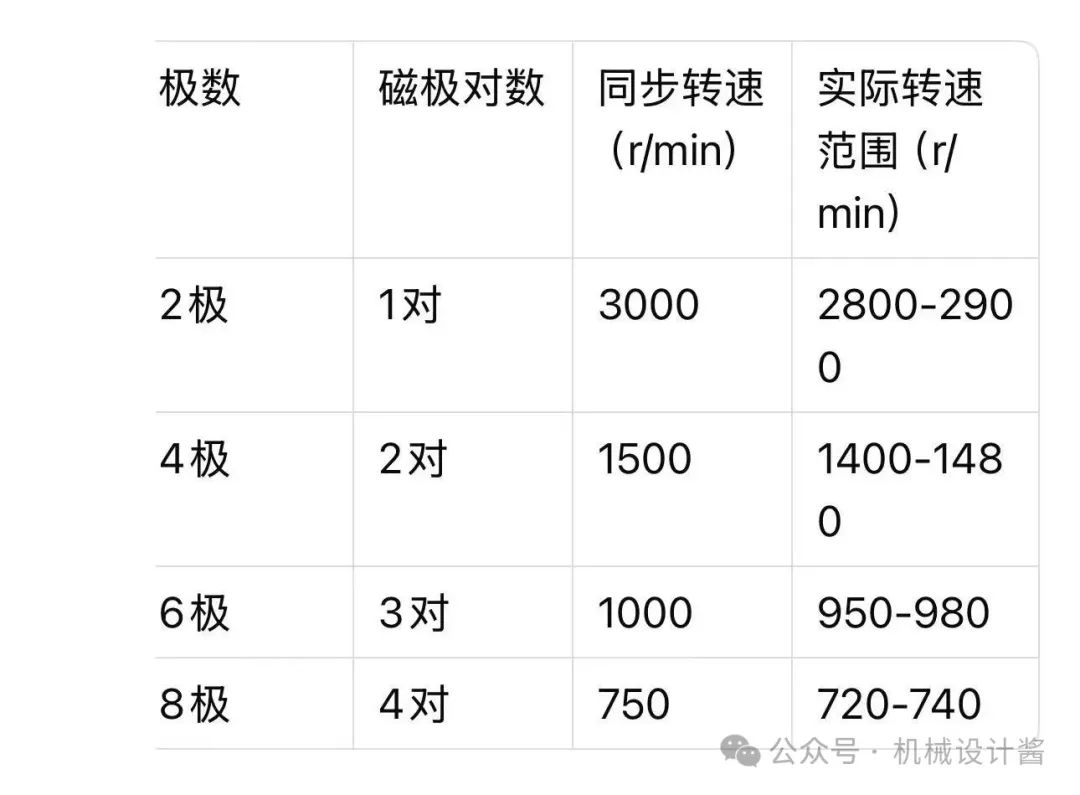 根據(jù)這個(gè)公式,我們可以計(jì)算出不同極數(shù)電機(jī)在50Hz電源下的同步轉(zhuǎn)速: