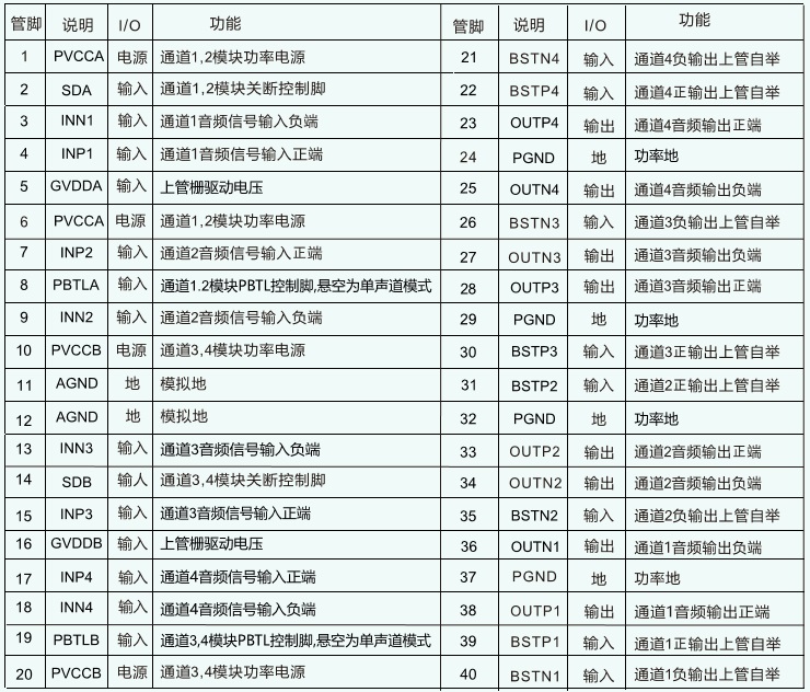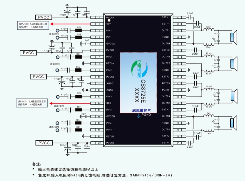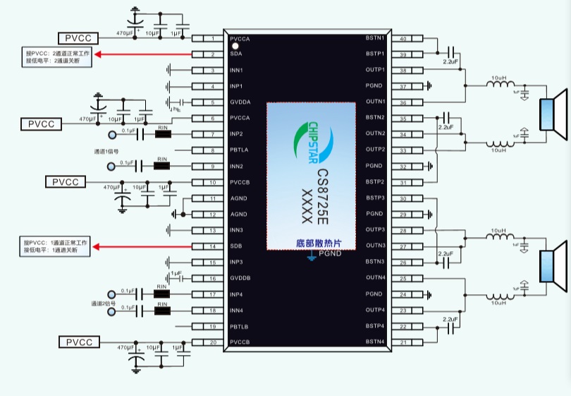 CS8725E是-款4X45W四通道D類音頻功率放大器,其可以兼容2.0/2.1/4.0多聲道音頻應(yīng)用,這款器件在底部設(shè)計(jì)了散熱焊盤,在供電電壓24V的情況下,8Ω負(fù)載最大可以輸出4x42W的連續(xù)功率.