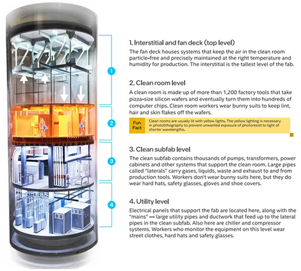 晶圓廠的核心是潔凈室層(Clean room level)。實(shí)際進(jìn)行制造過(guò)程的工廠車(chē)間潔凈室下方是次級(jí)晶圓廠(Sub-fab),一層或多層(通常為兩層),其中包含支持潔凈室操作所需的管道、管道、布線(xiàn)和設(shè)備。潔凈室層上方是一個(gè)間隙空間(Interstitial and fan deck),配有風(fēng)扇和過(guò)濾器,用于將空氣再循環(huán)到下面的潔凈室(Utility level),其中設(shè)計(jì)成本5%,土建成本35%,機(jī)電系統(tǒng)成本30%,潔凈室成本35%。一般7nm先進(jìn)工藝以下的晶圓廠總成本超過(guò)200億美元,其中建筑結(jié)構(gòu)本身需要花費(fèi)40億至60億美元,占總成本的10~20%,從成本角度來(lái)看,未來(lái)新晶圓廠的破土動(dòng)工在前期和持續(xù)支出方面都將比幾年前更加昂貴。根據(jù)統(tǒng)計(jì),中國(guó)臺(tái)灣建設(shè)晶圓廠大約需要19個(gè)月,新加坡和馬來(lái)西亞需要23個(gè)月,歐洲約34個(gè)月,而美國(guó)最長(zhǎng),可達(dá)38個(gè)月。