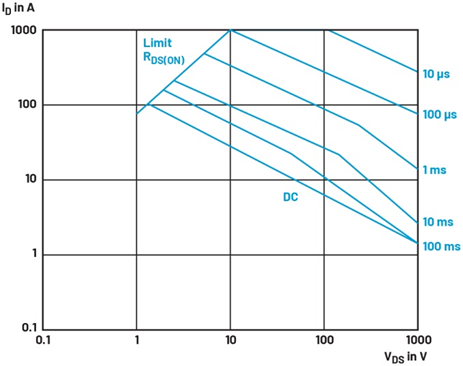 圖2顯示了MOSFET的典型安全工作區(qū)(SOA)曲線。SOA曲線定義了器件在不同電壓降下可承載的電流大小,以及能夠持續(xù)承載該電流的時(shí)長。如果希望有更大的電流長時(shí)間流過MOSFET,就必須選擇SOA范圍更大的MOSFET。SOA的范圍越大,MOSFET的尺寸也就越大。這同樣會(huì)增加元件的成本。