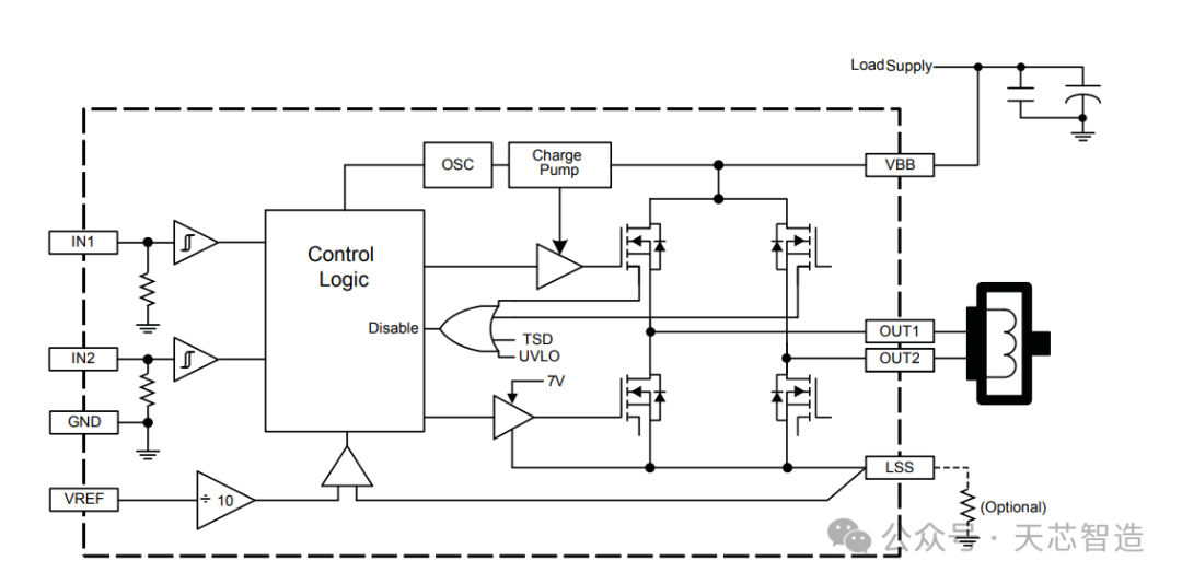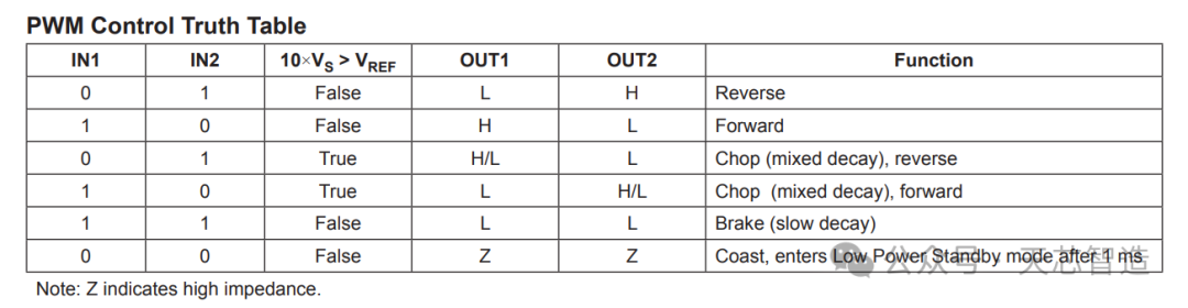其中IN1和IN2是作為PWM的輸入,具體請參考芯片手冊上的真值表。