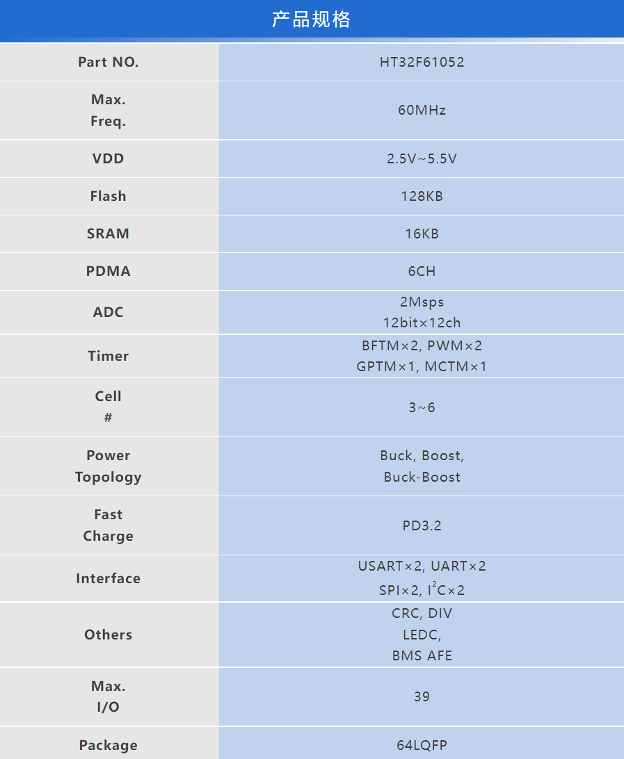 Holtek針對PD充電鋰電池產(chǎn)品,推出Arm® Cortex®-M0+ MCU HT32F61052,符合USB-PD 3.2規(guī)范并兼容Dual Role Port (DRP)雙向角色,內(nèi)建VCONN提供Type-C E-maker電源,允許最大48V/5A(240W) 功率,并支持3~6串的鋰電池保護,適合應(yīng)用于PD應(yīng)急啟動電源、PD便攜型充氣泵、PD工具電池包等。